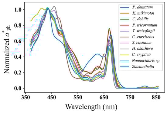 Eleven phytoplankton species, namely, three dinoflagellates (Prorocentrum dentatum, zooxanthella, and Karenia mikimotoi), six diatoms (Skeletonema costatum, Thalassiosira weissflogii, Chaetoceros debilis Cleve, Phaeodactylum tricornutum, Chaetoceros curvisetus, and Cyclotella cryptica), one cryptophyta (Heterosigma akashiwo), and one chlorophyte (Nannochloris sp.), which were frequently observed in Chinese ocean regions [7,8,15], were cultured in a laboratory incubator. The temperature was set at 18–20 °C, light intensity was 2500 lx, 12 h light and 12 h dark. The aph(λ) spectra of phytoplankton species were measured using a Lambda-1050 UV/Vis Spectrophotometer (PerkinElmer corporation, Boston, MA, USA). The chlorophyll a concentration (Cph) was measured using a F-2500 Fluorescence Spectrophotometer (Hitachi corporation, Tokyo, Japan). The representative mass-specific absorption spectra (normalized at 440 nm) of the 11 species are shown in Figure 2.