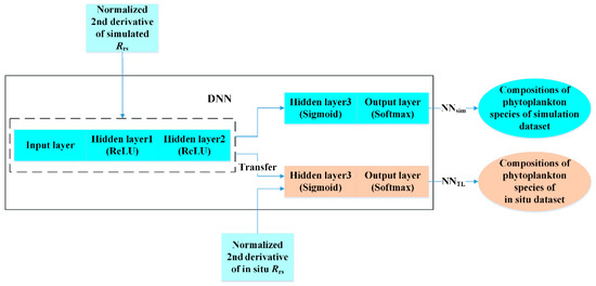 As described in Section 2.2.2, a large general simulation dataset was first generated, and a DNN was subsequently trained using this simulation dataset. However, the trained neural network was not directly applicable for the in situ dataset because of the differences in the numbers, as well as the types of phytoplankton species between the simulation and the in situ datasets. To cope with this challenge, we used the transfer learning technique to transfer part of the knowledge learned from the simulation dataset to the prediction model for the in situ dataset.