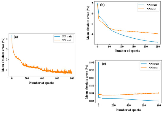 The DNN with transfer learning was tested; in addition, the conventional DNN was considered for comparative analysis. As shown in Figure 4, this includes mainly three parts: NNsim (simulation dataset), NNTL (combined with simulation dataset and in situ dataset), and conventional DNN (combined with simulation dataset and in situ dataset). The convergence process of NNsim is shown in Figure 4a, where MAE decreased rapidly in the first 20 epochs, the rate of descent flattened out with increasing epoch numbers, and we found that, after 800 epochs, MAE was less than 1%, and NNsim tended to be stable. By the transfer learning method, the trained parameters of first few layers in NNsim were preserved, after updating the last few layers with the in situ dataset, NNTL was well constructed (Figure 4b); the convergence process of NNTL was similar to that of NNsim and, after 250 epochs, the MAE of the test set was stable around 4%. The convergence process of the conventional DNN is shown in Figure 4c; the convergence process of the conventional DNN failed due to the enlargement of the MAE with the increasing epoch numbers.