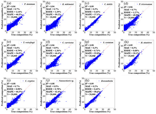 The NNsim-predicted compositions versus the true compositions of 11 phytoplankton species in the randomly selected 10% of the simulation dataset (there are 20,000 spectra). Namely, (a) P. dentatum, (b) K. mikimotoi, (c) C. debilis, (d) P. tricornutum, (e) T. weissflogii, (f) C. curvisetus, (g) S. costatum, (h) H. akashiwo, (i) C. cryptica, (j) Nannochloris sp., (k) Zooxanthella. The solid line is the 1:1 line.