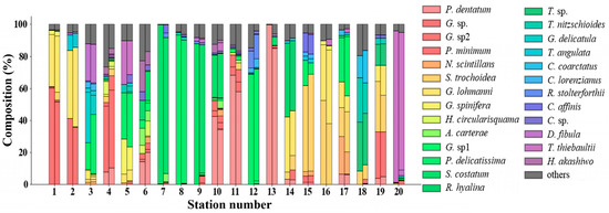 The phytoplankton species compositions of 20 stations in the validation dataset (Section 2.1). Each station has two stacked bars, with in situ measurements on the left and NNTL-predicted results on the right; the station numbers correspond to validation stations in Figure 1.