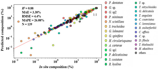 Specifically, the statistical indicators of 26 species predicted were calculated (Figure 7): there are 139 points in total (phytoplankton species composition greater than 0), and the in situ measurements and NNTL-predicted results presented a good correlation: R2 = 0.88, MAE = 3.38%, RMSE = 4.4%, and MAPE = 26.08%. In conclusion, the predicted results are acceptable.