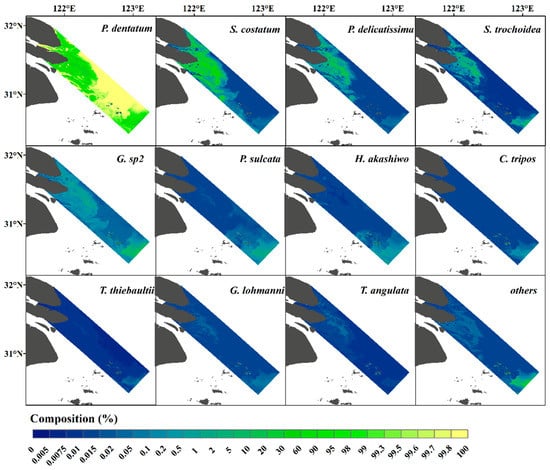 Through performing HICO data preprocessing (Section 2.3), the normalized 2nd derivative spectra data in each pixel of HICO were obtained, and the dimension of the spectra were kept consistent with the input layer in the NNTL. In the model output phase, we acquired the 12 most abundant species, which together accounted for more than 99% of the cell abundance of all species in each pixel on average. The predicted phytoplankton compositions of these 12 species and the sum of the remaining species (“others”) are shown in Figure 8. The composition of each species varied greatly from each other and, for the same species, the composition varied spatially: among the 12 species, P. dentatum occupied the largest composition from the whole image, whereas S. costatum and P. delicatissima accounted for relatively large proportions near the Changjiang Estuary.