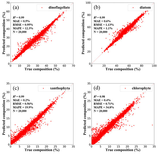 In Section 4.2, the phytoplankton composition inversion at the species level by transfer learning-based DNN was validated, and the predicted results are acceptable (R2 = 0.88, MAE = 3.38%, RMSE = 4.4%, and MAPE = 26.08%). Whether the method is applicable to inversion of phytoplankton composition at the community level is discussed below with respect to related tests and comparative analysis.