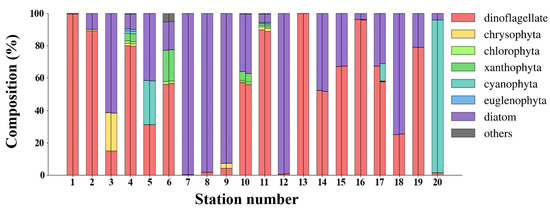 Samples were fixed with formaldehyde (5%) immediately after collection and transferred back for the laboratory analyses. In the laboratory, phytoplankton cells were first concentrated with 100 mL settlement columns for 24 to 48 h, then identified and counted using an inverted microscope (Olympus corporation, Tokyo, Japan) [50,51]; for the method, we referred mainly to Utermöhl [52]. A total of 242 phytoplankton species were identified, including 129 diatoms, 97 dinoflagellates, 5 chlorophytas, 5 chrysophytas, 4 cyanophytas, 1 xanthophyta, and 1 euglenophyta (the classification was mainly based on http://www.algaebase.org/); after species identification and cell counting, the composition of each species in each station was calculated.