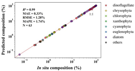 A transfer learning-based DNN, combined the simulation dataset with in situ dataset at the community level, short as NNCTL, was also established. The in situ and NNCTL-predicted compositions (%) in the validation dataset (Section 2.1) are shown in Figure 10. The NNCTL-predicted seven community compositions (dinoflagellate, chrysophyta, chlorophyta, xanthophyta, cyanophyta, euglenophyta, and diatom) are highly consistent with the in situ measurements. In addition, the statistical indicators of seven communities predicted were calculated (Figure 11): there are 63 points in total (phytoplankton community composition greater than 0), indicating R2 = 0.99, MAE = 0.33%, MAPE = 1.74%, and RMSE = 1.28%.