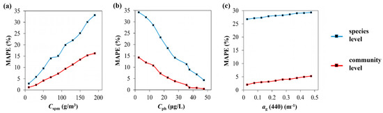MAPE (%) of transfer learning-based DNN-predicted results of phytoplankton composition at the species level (blue line) and at the community level (red line) under various conditions of SPM concentration (a), chlorophyll a concentration (b) and CDOM absorption coefficient at 440 nm (c).