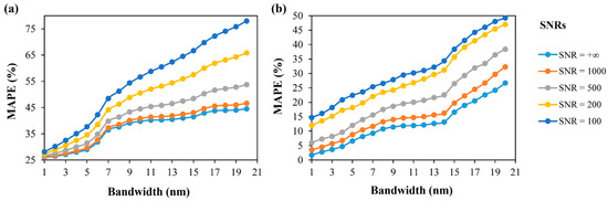 The effects of the spectral resolution and signal-to-noise ratio (SNR) to the transfer learning-based DNN at the species and community levels were analyzed synchronously. Different proportions of random noise were added to the simulated and in situ spectral data (at the species and community levels) simultaneously, and the SNR was set as 100, 200, 500, 1000 and +∞ separately. The simulated hyperspectral Rrs and in situ Rrs with 1 nm bandwidth was resampled at different bandwidths synchronously, and the bandwidth was set from 1 to 20 nm and increased at 1 nm intervals. Then, we conducted data preprocessing as described in Section 3.2.1, and the transfer learning-based DNN for specific spectral resolution and SNR at the species and community levels was retrained. Afterward, the transfer learning-based DNN was used to predict phytoplankton species/community compositions under the corresponding spectral resolution and SNR conditions. The results of the accuracy evaluation are shown in Figure 13 (a at the species level and b at the community level). It was found that the MAPE increased with increasing bandwidth and decreased with the increasing SNRs. For the bandwidth greater than 5 nm (species level) and greater than 14 nm (community level), the MAPE increased significantly. The MAPE was 29.61%, 31.46%, 34.56%, and 37.69% (bandwidth equal to 5 nm at the species level), and it was 16.24%, 22.59%, 31.19%, and 34.34% (bandwidth equal to 14 nm at the community level), corresponding to 1000, 500, 200, and 100 of the SNR, respectively. Therefore, for ocean color satellite sensors in the future [78], sensors with bandwidths less than 5 nm at the species level, sensors with bandwidths less than 14 nm at the community level, and concurrently with higher SNR should be recommended.