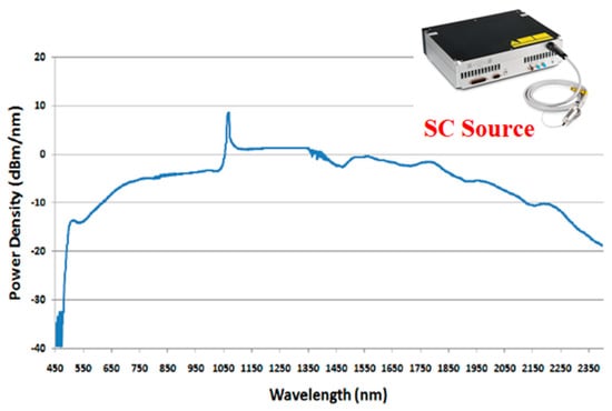 In order to increase the spectral range of the AOTF-HSL, SC source (Figure 2) employed in this paper is with a large single pulse energy (>19 uJ) and the pulse width is two nanoseconds with power density distribution shown in Figure 3. The total power of the selected SC model is more than 8W, and the M2 factor of SC source is better than 1.1 with a 200 MHz maximum repeating rates. With such a powerful laser source, the effective range of AOTF-HSL is improved to several tens meters based on the previous experiments [32].