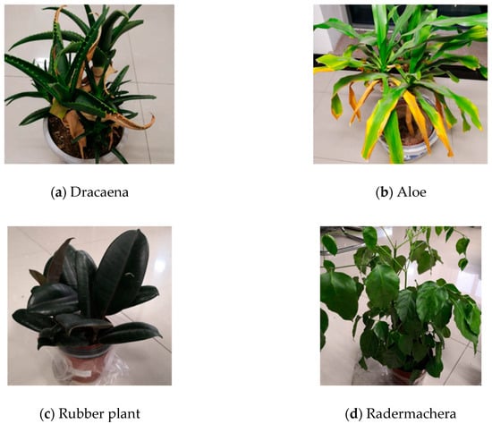 Four different plants employed in lab experiment. (a) Dracaena, (b) Aloe, (c) Rubber plant, (d) Radermachera.
