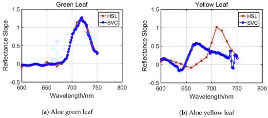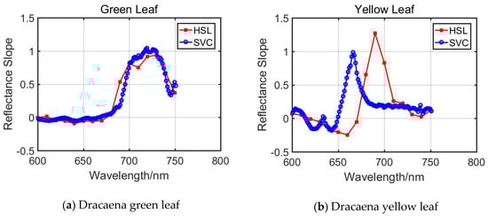 The Dracaena leaves spectral measurement results are shown in Figure 7, Figure 8, Figure 9 and Figure 10. In Figure 7, the first-order derivative spectral profiles of green leaf and yellow leaf from AOTF-HSL and SVC are presented. Figure 8 shows the results of aloe green and yellow leaf, and the remaining Figure 9 and Figure 10 are the spectral slope curves for rubber plant and radermachera green leaf, respectively.