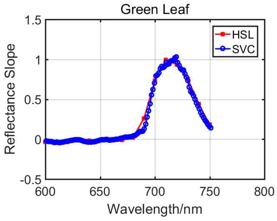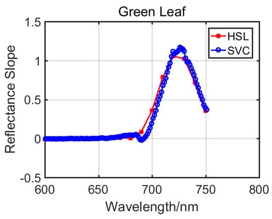 In this research, leaves from four different plants were measured to evaluate the capacity of using the spectral from the AOTF-HSL for vegetation RE-related parameter extraction. In the vegetation research community, the important “Red Edge” position (REP) parameter is closely related to various physical and chemical parameters of vegetation, and it is commonly employed to indicate the growing states of the vegetation and monitor the plant activity [34,35]. Thus, the RE related parameters were selected as the representative for evaluating the HSL in vegetation applications. As shown in Figure 1, REP refers to the position of an inflection point of the first derivative of reflectance values, and it usually locates in the red spectrum band [33,34,35,36]. REP result comparison between the HSL and SVC spectrometer could provide a preliminary evaluation of the utility of HSL in vegetation parameter extraction.
