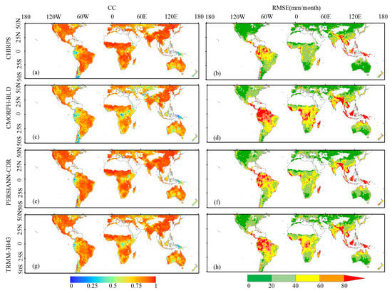 Spatial grid distributions of correlation coefficient (CC) and root-mean-square error (RMSE) between QPE product precipitation estimates and CRU observations from 2000 to 2016 (a–h).