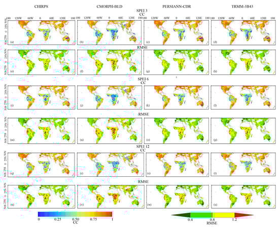 Spatial grid distributions of CC and RMSE for the SPEIs (SPEI3, SPEI6, and SPEI12) between QPE products and CRU gauge observations from 2000 to 2016 (a–x).