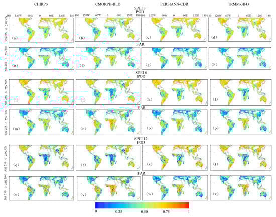 The POD and FAR of the 3-, 6-, and 12-month SPEI for each QPE product versus CRU product from 2000 to 2016 (the first and second rows represent the SPEI3, the third and fourth rows represent the SPEI6, and the fifth and sixth rows represent the SPEI12) (a–x).