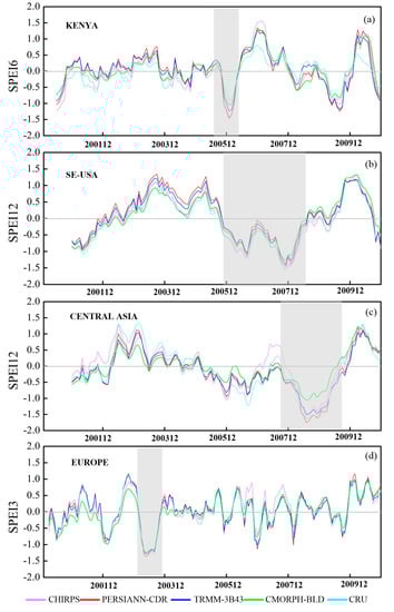 The monthly areal averaged SPEI series for the four QPE products and CRU observations between 2000 and 2016 are plotted in Figure 6. The dotted domain in the Table 5 for each precipitation product was used to calculate the areal averaged SPEI time series in Figure 6 and Figure 7. The drought duration of each drought event is highlighted with a gray background in each plot. The SPEI time series of four satellite-based precipitation products and CRU precipitation are generally in agreement from 2000 to 2010. All datasets (except for CMORPH-BLD) can determine the five typical drought events using an areal mean SPEIs below −1 (moderately dry). The CMORPH-BLD is not able to effectively pick up the 2008 Central Asia drought and the 2006 Kenyan drought despite several grid values being less than −2.25.