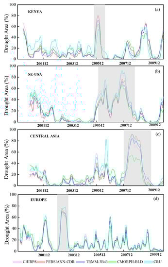 This study also calculated the proportion of the monthly drought grid number to the monthly total spatial domain number using the drought event criteria mentioned above for each drought event. The calculation results are shown in Figure 7, where the drought event durations are labeled using a gray color. These results show that the drought area proportions of the five drought events are general consistent with the SPEI time series shown in Figure 6. Overall, the four precipitation datasets can distinguish more than 60% of drought extents for every drought event under moderate dry conditions with the exception of CMORPH-BLD estimate for the 2008 drought in Central Asia.