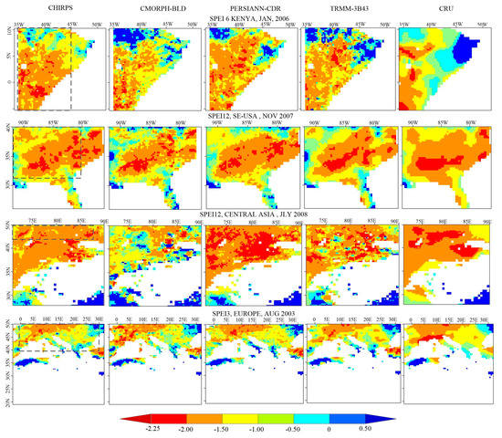 - All datasets (except for CMORPH-BLD) could detect all four typical drought events in Table 5 using the domain-averaged SPEIs of less than −1. The CMORPH-BLD was not able to effectively detect the 2007 central Asian drought and the 2006 Kenyan drought. The spatial SPEI patterns of the four QPE products agreed very well with that of the CRU precipitation for the 2007 southeastern USA drought and the 2003 western European drought. CHIRPS had a distinct over-recognition of drought severity for the 2006 Kenyan drought. In addition, CMORPH-BLD had obvious spatial discrepancies in comparison with other precipitation products for the 2008 central Asian drought.