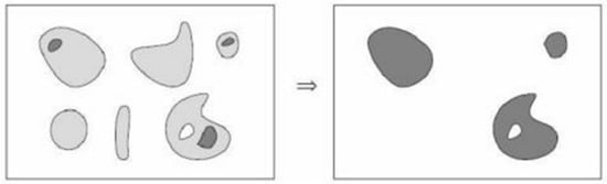 Mathematical morphology is an effective image feature extraction tool that describes the local characteristics of images. The basic morphological operations are corrosion, expansion, and opening and closing operations, which act on the image through a series of shape regions called structuring elements (SEs). The morphological opening and closing reconstructions are another common kind of operator, which have a better shape preservation ability than the classical morphological filters. Since the shape of the SEs used in the filtering is adaptive, with respect to the structures present in the image itself, it nominally introduces no shape noise [42,43], as shown in Figure 1. In the proposed method, we extract the spatial information of the images based on “opening reconstruction followed by closing reconstruction” (OFC), which can simultaneously smooth the bright and dark details of the structure while maintaining the overall feature stability and improving the consistency within the object area [44,45].
