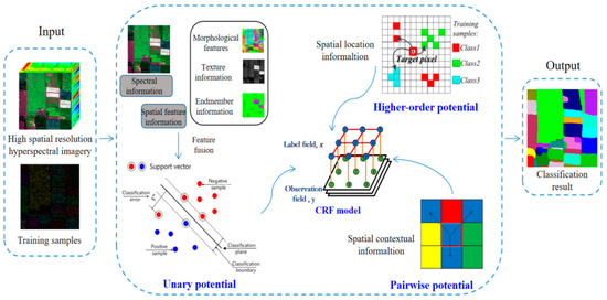 Therefore, in the classification problems of the CRF model, maximizing the posterior probability distribution is equivalent to minimizing the energy function . In the proposed method, a higher-order CRF model, with the ability to encode higher-order spatial information, is used to improve the classification performance. The higher-order CRF model can be written as: