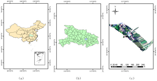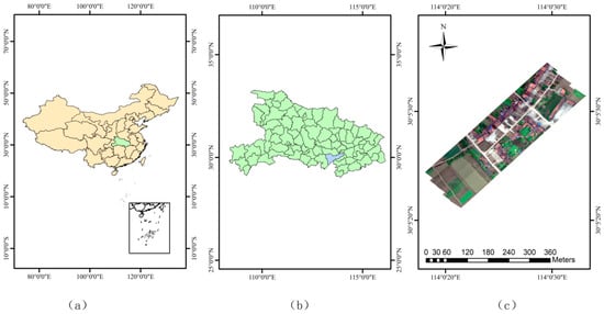 (a) The location of Hubei Province in China. (b) Administrative area map of the city of Hanchuan in Hubei Province. (c) The study site.