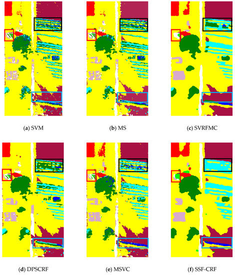 The experimental results corresponding to the different classification algorithms (SVM, MS, SVRFMC, DPSCRF, MSVC, SSF-CRF, and SSLF-CRF) are shown in Figure 6. Figure 6a is the classification result of SVM, which delivers a salt-and-pepper appearance because this algorithm does not consider the spatial information. Figure 6b–g are the results of the algorithms that consider the spatial context and spatial feature information, where the classification effects are smoother and the visual effects are better than those of the SVM algorithm. However, due to the influence of spectral variation, the different algorithms show different performances in terms of detail retention. For example, as shown in Figure 5a, the spectra of the iron sheet, gray roof, pea, tree, and soy classes have a certain similarity, so it is a challenging task to accurately distinguish these classes. In Figure 6b–e, the iron sheet is not easily identified, and for the most part is misclassified as gray roof and road, as shown by the red box in the figures. The features in the black box are pea, but this part was misclassified as tree or soy in most of the methods.