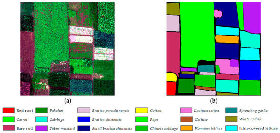 The second group of experiments used a UAV-borne hyperspectral remote sensing image with a 0.4-m spatial resolution acquired in Honghu City, Hubei Province, China, in November 2017. This image has a spatial dimension of 400 × 400 pixels and 270 spectral bands. In these experiments, 18 classes of interest were considered: red roof, bare soil, rape, cotton, Chinese cabbage, pakchoi, cabbage, tuber mustard, Brassica parachinensis, Brassica chinensis, small Brassica chinensis, Lactuca sativa, celtuce, film-covered lettuce, romaine lettuce, carrot, white radish, and spouting garlic. The overview of the area is shown in Figure 7a by the true-color image, and the corresponding reference ground truth is shown in Figure 7b. The numbers of randomly selected training and test samples for each class are listed in Table 4.