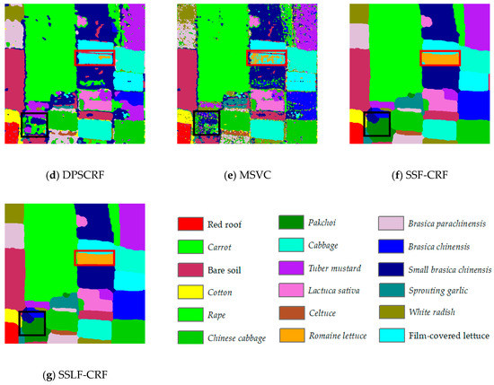 For the experiments with the Honghu dataset, the experimental results corresponding to the different classification algorithms (SVM, MS, SVRFMC, DPSCRF, MSVC, SSF-CRF and SSLF-CRF) are shown in Figure 8a–g, respectively. As with the Hanchuan dataset, the classification result of the SVM algorithm in Figure 8a contains a large amount of salt-and-pepper noise. After considering the spatial context information, the classification effects of the various algorithms are greatly improved. As shown in Figure 8b–g, the salt-and-pepper noise is significantly reduced, and the boundaries of the various types of features are relatively complete. However, several types of crops with similar spectra in the Honghu dataset, such as romaine lettuce/film-covered lettuce and pakchoi/rape, are apparently misclassified due to the influence of spectral variation. As shown by the red box in Figure 8, the romaine lettuce is almost completely classified as film-covered lettuce in the classification results of the MS, SVRFMC, DPSCRF, and MSVC algorithms. The crop in the black box is pakchoi, but this is misclassified as rape, small Brassica chinensis, bare soil, and other features by the other algorithms. The SSLF-CRF algorithm considers the spatial features and the spatial location information, so for the above land-cover classes, not only are the types correctly identified, but the boundary shapes and details are also kept intact.