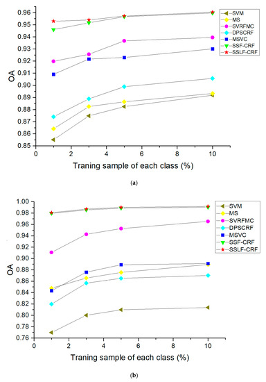 Training sample ratios of 1%, 3%, 5%, and 10% were used for each algorithm with each dataset to validate the SSLF-CRF method proposed in this paper. In all the experiments, we randomly selected 1%, 3%, 5%, and 10% training samples to validate each algorithm, and the remaining 99%, 97%, 95%, and 90% of the samples were used to evaluate the classification accuracy. The classification OAs for the different classification algorithms under different training sample sizes are shown in Figure 9.