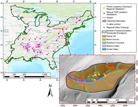 Map of regional study area (left), which encompasses the Eastern Temperate Forests and Northern Forests Level 1 ecoregions in the Eastern U.S. Purple points indicate Soil Climate Analysis (SCAN) and North America Fluxnet (AMERIFLUX) sites that contributed to training the regional soil moisture analytical relationship (SMAR) model in this study and corroborating its predictions at a site-level. The Shale Hills is indicated by the red point. In the enlarged Shale Hills catchment map (right), yellow squares indicate sites that are used to train the Shale Hills catchment SMAR model and cyan points indicate manual time domain reflectometry (TDR) stations where data were used for validating the Shale Hills SMAR model. Data at the yellow squares also validates the regional SMAR model.