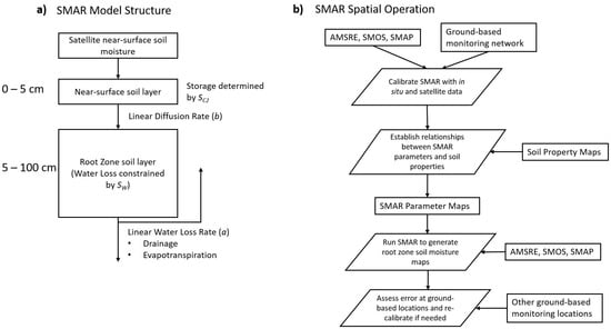 (a) Flow diagram and schematic of the soil moisture analytical relationship (SMAR) model with arrows indicating the relative flow of moisture across each model process. (b) Flow diagram of the spatial SMAR modeling approach used in this study.