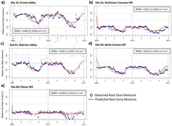 A, RMSE of 0.06 cm3 cm−3 has been taken as a benchmark of acceptable model performance when using AMSRE data to predict near-surface soil moisture [43,44], so we analyzed where each model meets this benchmark across the Shale Hills catchment. Given that only 68 sites met any criteria for training the EUS regional SMAR, a thorough validation could not be conducted across the EUS region. However, the automatic sensors at Shale Hills were used to validate the regional EUS SMAR maps for Shale Hills alone, since they were excluded from the regional SMAR model training and provide a continuous time-series of soil moisture data. We did get a sense on how initial conditions may affect the regional SMAR model accuracy, since the model optimization at EUS sites was initialized at that site’s first RZSM measurement, while the regional SMAR model was initialized at the beginning of each satellite platform’s time-series. The initial data of each satellite’s time-series was always earlier than the initial date of the in situ training datasets used to estimate EUS parameters.