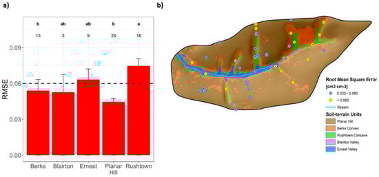 (a) Bar plots of mean root mean square error (RMSE; cm3 cm−3) of the spatial Shale Hills SMAR model grouped by soil–terrain unit. Hinges above the bars indicate standard error for each group. Letters indicate statistically significant differences (p < 0.05) between soil–terrain groupings of RMSE that are based upon a post-hoc, Dunn’s pairwise comparisons test. Numbers underneath the letter qualifiers indicate the sample size of each group. The dashed line represents NASA’s quality benchmark for soil moisture predictions using satellite observations. (b) Map of the root mean square error (RMSE) at each manual time domain reflectometry (TDR) monitoring location resulting from the spatial SMAR validation analysis.