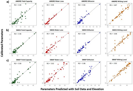 The trained neural network did a fine job at predicting SMAR parameters across all three satellite platforms with the scaled CONUS soil data (Figure 5a–c). The neural network models reveal no predictive bias or any serious heteroscedasticity in their predictive error for any parameter across all platforms. The neural networks that predict SMAR parameters from SMOS and SMAP data show higher R2 values than those from AMSRE for all SMAR parameters but water loss (a). Notably, the neural network accuracy declined when the USGS elevation was not included, indicating elevation is an important covariate to include along with CONUS soil properties for estimating spatial patterns of SMAR. In total, the variables used in the neural network model to predict each SMAR parameter map are the elevation; surface and root-zone clay, sand, and silt content; and the surface and root-zone porosity and bulk density.