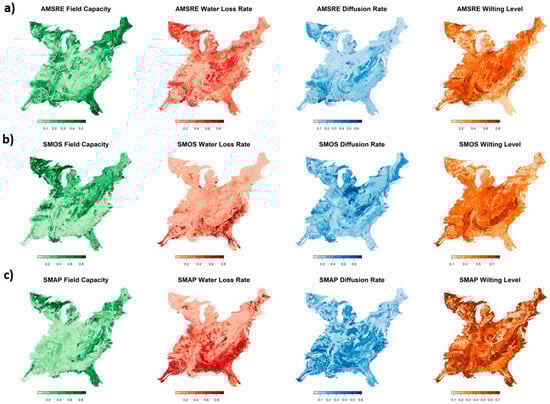 Regional maps of SMAR parameters generated with predictions from trained neural network models arranged by the parameters (left to right): SC1, a, b, and SW for (a) AMSRE-, (b) SMOS-, and (c) SMAP-estimated parameters.