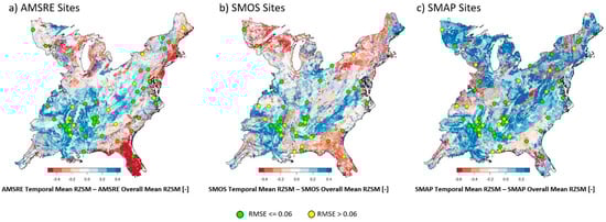Maps of the difference between the temporal mean of RZSM predictions from the regional SMAR model and the overall mean of these predictions made using (a) AMSRE, (b) SMOS, and (c) SMAP satellite data as inputs into SMAR. Points indicate SCAN/AMERIFLUX training sites that are colored according to whether they exceed a quality benchmark of RMSE = 0.06 cm3 cm−3 or not. The RMSE is based upon predictions associated with each satellite platform individually.