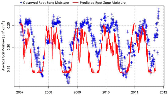 Spatial estimates of volumetric soil moisture content (cm3 cm−3) within the top one meter of soil (i.e., the ‘root zone’) are important for simulating hydrologic and ecosystem processes [1,2,3], such as forecasting agricultural productivity [4] and providing a more precise representation of evapotranspiration (ET) feedbacks for climate change projections [5]. Mapped estimates of root zone soil moisture content also support military trafficability assessments [6], improve flood predictions [7], and can assist with predicting the severity of forest fires [8]. The technological advancement of satellite-based microwave scanning platforms has improved the prospects of producing high quality, globally distributed root-zone soil moisture data products [9], but in situ data is still important for validating root zone soil moisture models [5,10]. Fortunately, there has been an increase in active soil moisture monitoring locations around the world [11,12].