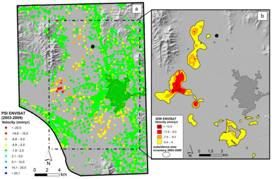 Since the PSI density revealed in both ENVISAT and SENTINEL-1 datasets is quite low (Table 1 and Figure 3a and Figure 4a, respectively) and since the aim was to derive a polygonal inventory of most subsiding areas over the plain, a spatial interpolation of PS InSAR data was performed. In particular, we interpolated the point-wise velocity values throughout the Inverse Distance Weighted (IDW) spatial interpolator in ArcGIS software [59]. We used a quadratic weighting power of 2 within a variable search radius neighborhood and 12 as the number of points for calculating the interpolated velocity, and we obtained interpolated IDW velocity raster maps with 10 m cell-size. To create the subsidence areas inventories, we considered significant velocities higher than 4 mm/yr (in absolute value)—which is a value corresponding to 2σ—discarding lower values, finally contour lining the IDW velocity surfaces. The resulting subsidence inventories referred to 2003–2009 and to 2014–2019 are shown in Figure 3b and Figure 4b, which respectively cover approximatively an area of 25 and 31 km2.