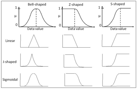 The fuzzy set membership functions of the variables can be chosen according to knowledge-based weightage and following some defined curve functions. The membership function curve (hereafter indicated as μ) describes the degree of belonging of each data to each fuzzy set and takes a value between 0 and 1. The μ function curve represents the data values of the variable on the x-bar and the membership μ value on the y-bar, and can follow different function types. By simplifying, three basic curves commonly used to describe the type of fuzzy membership functions are the Bell-shaped curve, Z-shaped curve, and S-shaped curve. Then, according to the shape of the curve and to the positions of the inflection points, each type of curve can be sigmoidal, j-shaped or linear [63] (Figure 5). If the relationship between the value and the fuzzy membership does not follow any of the above functions, a user-defined fuzzy membership function can be used.