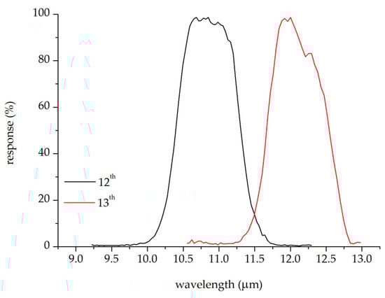 where ei is the emissivity of channel i; λ is the wavelength; min and max correspond to the minimum and maximum wavelength, corresponding to the spectral response function of channel i, respectively; β(λ) is the percentage of spectral response corresponding to wavelength λ; and e(λ) is the measured emissivity corresponding to wavelength λ.
