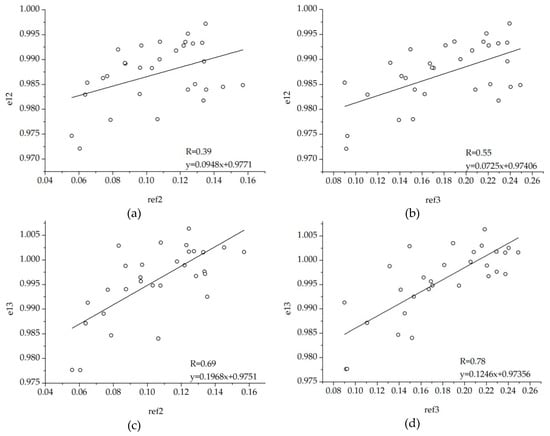 Correlation analysis between measured channel emissivity and reflectance, where (a) is the correlation analysis between e12 and ref2, (b) is the correlation analysis between e12 and ref3, (c) is the correlation analysis between e13 and ref2, and (d) is the correlation analysis between e13 and ref3.