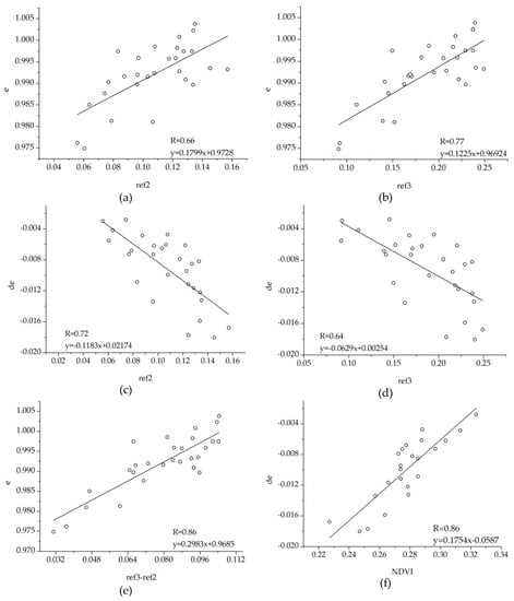 Correlation analysis between average channel emissivity and channel reflectance and its combined parameters, where (a) is the correlation analysis between e and ref2, (b) is the correlation analysis between e and ref3, (c) is the correlation analysis between de and ref2, (d) is the correlation analysis between de and ref3, (e) is the correlation analysis between e and “ref3–ref2”, and (f) is the correlation analysis between de and normalized vegetation index (NDVI).