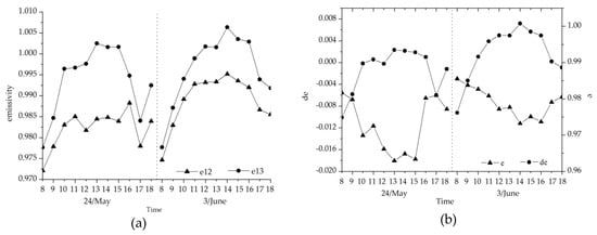 Figure 6 shows the diurnal variation of the measured emissivity for two typical sunny days from 08:00 to 18:00. In Figure 6a, the e12 and e13, which correspond to the 12th and 13th channels of the AGRI, are between 0.97 to 0.99 and 0.97 to 1.005, respectively. Their diurnal amplitudes are 0.02 and 0.03 and their range of variation is small. However, the diurnal variations are obvious and reach their maximum values at noon. Figure 6b shows the diurnal variation of the mean and difference of channel emissivity. The diurnal variation of channel emissivity difference is also obvious, but it reaches its minimum value at noon. When compared with the parameters of channel emissivity on 24 May and 3 June, the average emissivity of the two channels increases and the difference of emissivity decreases along with the growth of vegetation.