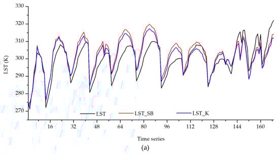where LST_SB is the land surface temperature estimated by the B&L algorithm and the Sobrino emissivity model [], the unit is K, and p and m are the calculation parameters related to emissivity: