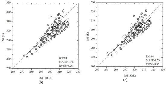 Figure 10b compares the observed value with the LST estimated by the B&L algorithm optimized based on the SB emissivity model. By comparing this figure with Figure 7b, one can see that the estimated LST is closer to the measured value in the high temperature region, but the estimated LST is lower than the measured value in the low temperature region. Therefore, the LST estimated by the B&L algorithm optimized based on the SB emissivity model is not ideal, and the RMSE increases by 0.6 K after optimization, thereby suggesting that the original coefficients of the B&L algorithm are appropriate for the SB emissivity model and that local optimization cannot improve the retrieval accuracy of this algorithm.