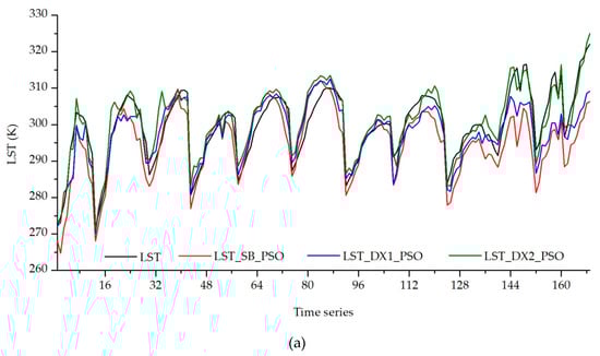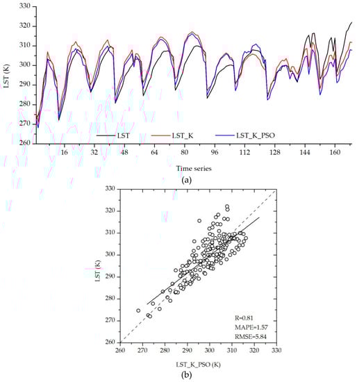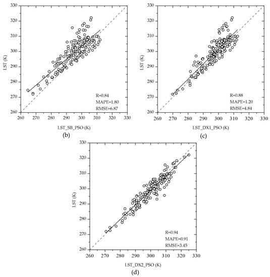 As can be observed from the LST estimated by the local split-window algorithm with optimized PSO, the original algorithm coefficients are identified as the optimal values for the local split-window algorithms after a long period of testing and improvement. Moreover, the accuracy of LST retrieval cannot be improved by algorithm optimization without changing any other parameter estimation model. To improve the LST retrieval accuracy, each parameter of the algorithm must be carefully estimated, and the coefficients of this algorithm must be redefined by using the artificial intelligence algorithm.
