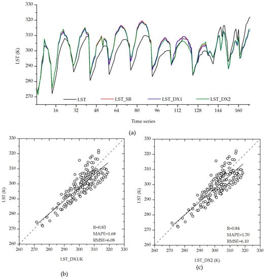 Comparison of LST retrieved by different emissivity models and measured values; (a) is the time series, (b) is the LST results based on the DX1 emissivity model, and (c) is the LST results based on the DX2 emissivity model.