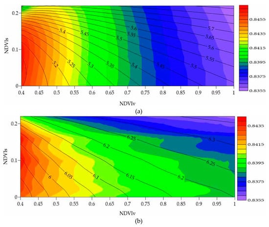 The results show that the Kerr algorithm only involves the calculation of vegetation coverage, while the calculation of vegetation coverage involves the determination of NDVIv and NDVIs. The differences in the LSTs estimated by the Kerr algorithm resulting from the changes in NDVIv and NDVIs are shown in Figure 11. Based on FY-4A data, a smaller NDVI corresponds to a higher correlation and a smaller RMSE between the LST estimated by the Kerr algorithm and the measured value. By contrast, a larger NDVIv value corresponds to a smaller correlation coefficient and a larger RMSE between the LST estimated by the Kerr algorithm and the measured value in Northwest China. With increasing NDVIs, the color change becomes more obvious and the contour distribution becomes denser, especially at NDVIs values of above 0.2. In other words, with increasing NDVIs, the gradient of the correlation coefficient and the RMSE between the LST estimated by the Kerr algorithm and the measured value obviously increases. Given that the results of the B&L algorithm are similar to those of the Kerr algorithm, these results will not be discussed in detail. In sum, for retrieving LSTs in Northern China using FY-4A satellite data, the NDVIs and NDVIv should not exceed 0.12 and 0.5, respectively. In this way, the deviations in the RMSE resulting from the changes in the NDVIs and NDVIv values can be controlled within 0.1 K when the LST is estimated by the Kerr algorithm.