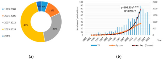 The total number of research publications (TP) related to CORINE land cover from 1989 until 29th April 2019 equals 873, which consists of as many as 1.32% of the worldwide research on land cover. Until 2000, the reference year of the first CLC updating, only 50 papers were published. Over the next several six-year gaps between subsequent inventories, the number of publications continued to double, from 107 articles published between 2001 and 2006, to 253 papers published between 2007 and 2012, and to as many as 430 items published between 2012 and 2018 (Figure 1a). The cumulative number of publication (see Figure 1b) is described by the exponential function (R-squared = 0.9485). The average article length of 11–12 pages (standard deviation (σ) is equal to 0.38) vary slightly with the coefficient of dispersion equal to 0.362. Since 1989, the average publication was written by two authors affiliated with only one organization. After 1999, the average number of authors per paper increased to four researchers from two countries. Research output is mainly documented in English (850 publications, 96.0%). However, other European languages were also used: Spanish (10 papers), French (6), German (6), Turkish (5), Polish (3), Czech (2), and Croatian, Italian, Slovak with one publication each.
