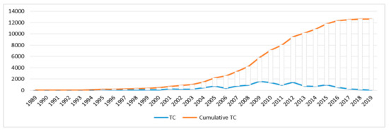 The 873 publications related to CLC were cited 12,695 times by 10,567 papers. The rate of self-citations was just 6.3%. As many as 497 (56.9%) publications were referred at least once a year, 16 of them were referred more than 10 times each year. Each of 53 research works has been quoted at least 53 times; therefore the h-index of publications amounts to 53. However, as many as 23.7% of publications were not cited at all, among them three papers published in conference proceedings in 1989, 1991, and 1993. The number of citations increased until 2009, with the peak value equaling 1558, and then slightly decreased, achieving the amount of 95 in 2018 (Figure 2). However, the total cumulative citation has been growing exponentially, according to equation . The distinct growth in the number of publications and the citations shows the steady increase and importance of CORINE land cover data in research applications over the past three decades (Table 2).